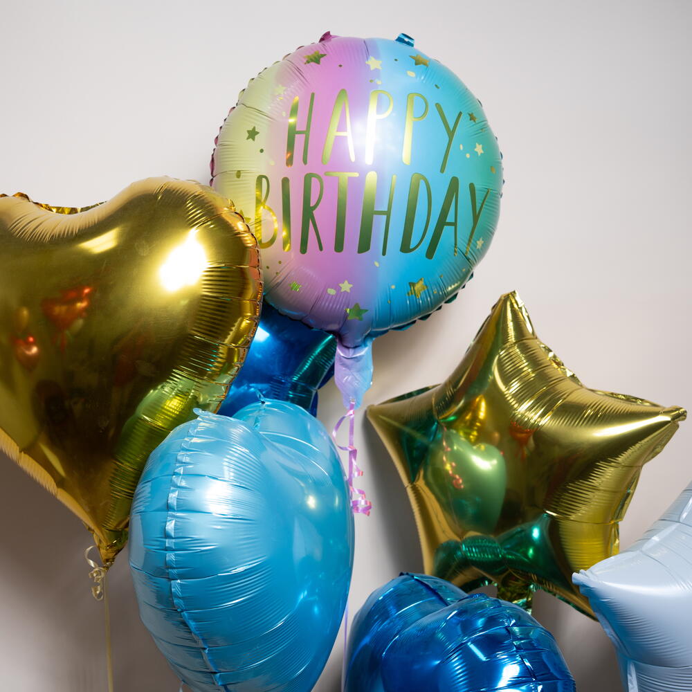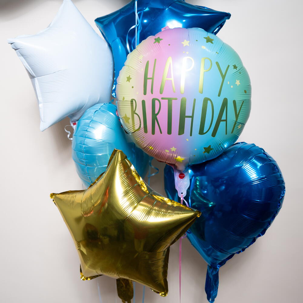 Happy Birthday Colorful Heart Star Foil Balloon Set includes 7 balloons: 1 colorful “Happy Birthday” round balloon, 3 heart-shaped balloons (gold, light blue, dark blue), and 3 star-shaped balloons (dark blue, gold, white) with a helium float time of approximately 8–10 hours, perfect for birthday celebrations and party décor. 🎈✨