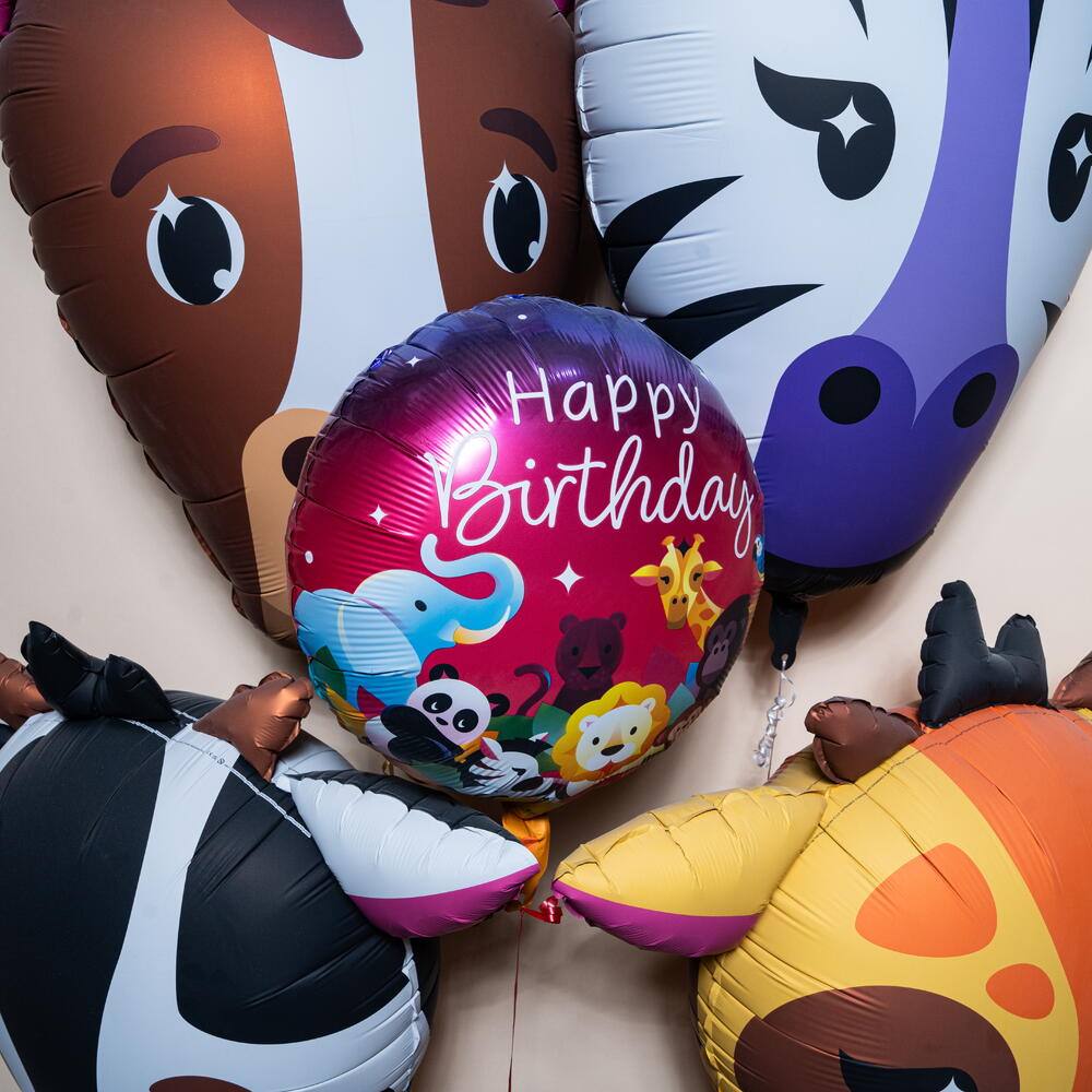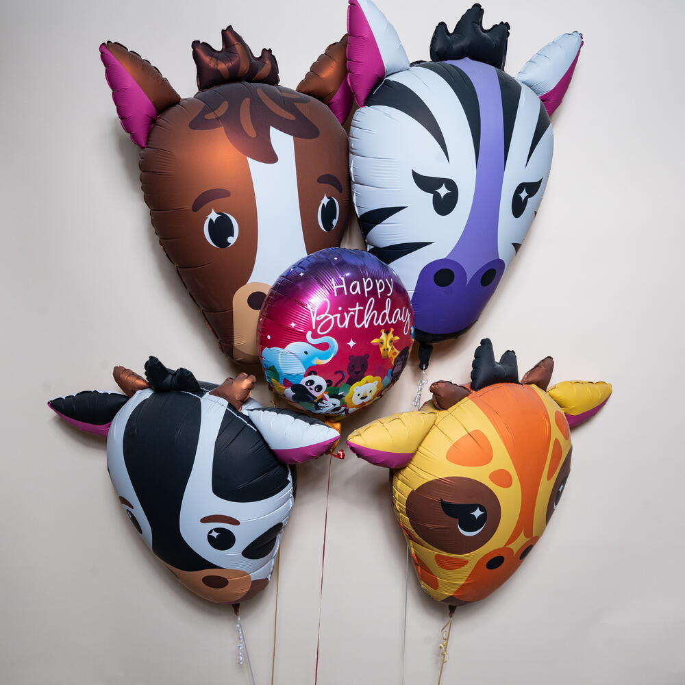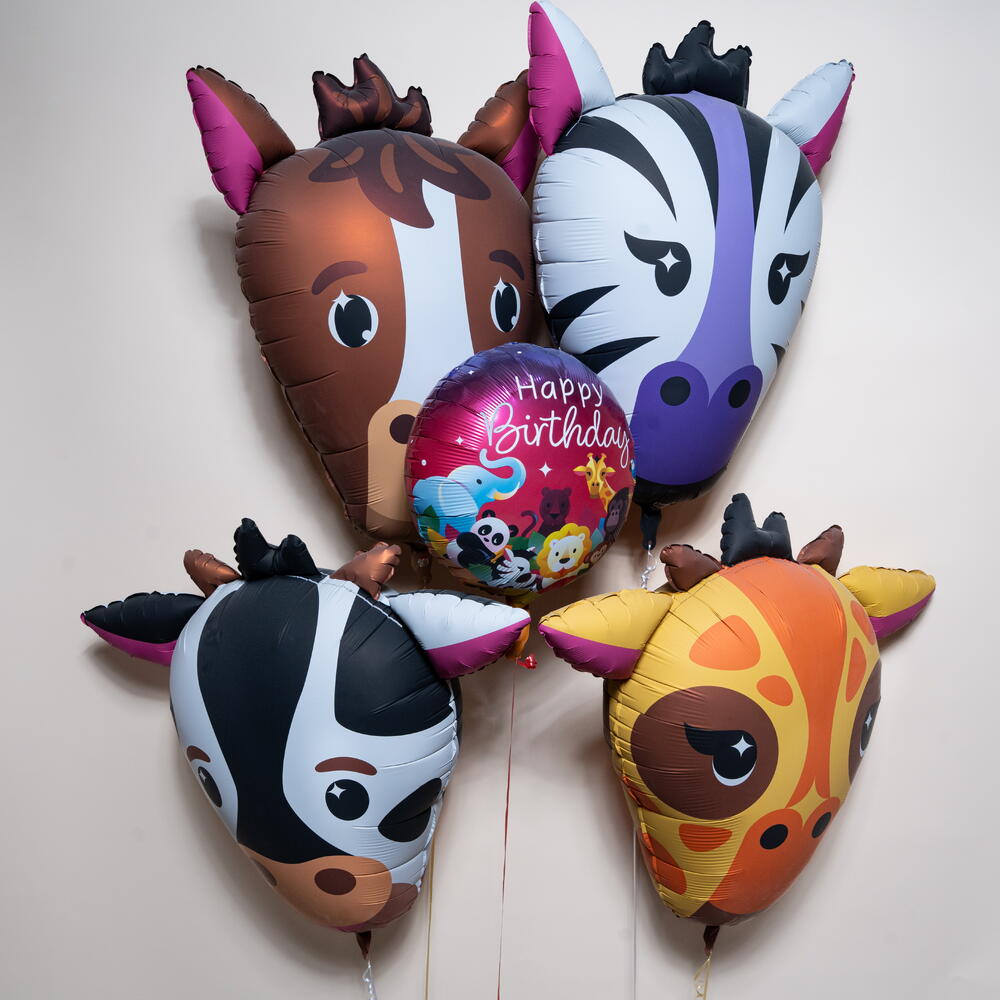Jungle Animal Faces Happy Birthday Foil Balloon Set with horse, zebra, cow, and giraffe face balloons plus a round Happy Birthday jungle balloon. This 5-piece animal foil balloon set is ideal for kids’ birthday parties, jungle theme celebrations, baby showers, and party décor. Long-lasting foil balloons with approximately 8–10 hours helium float time create a bright, fun, and festive atmosphere for photos and decorations.
