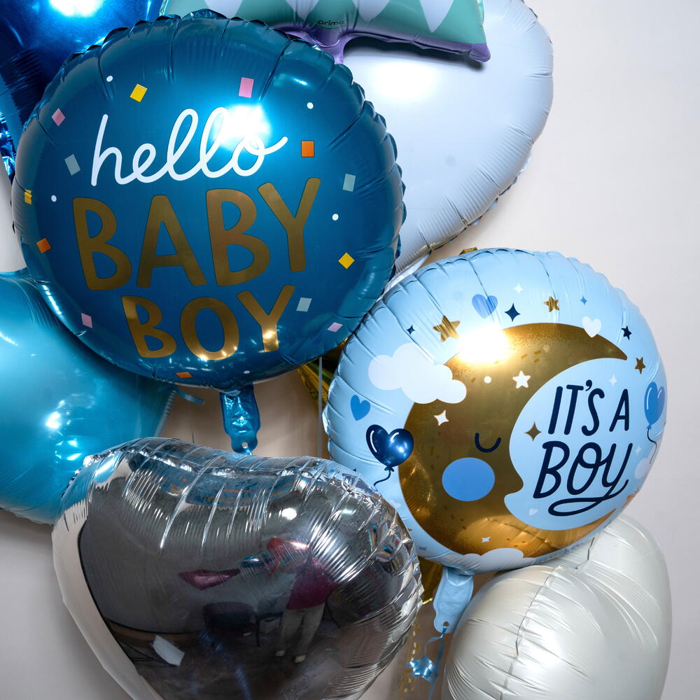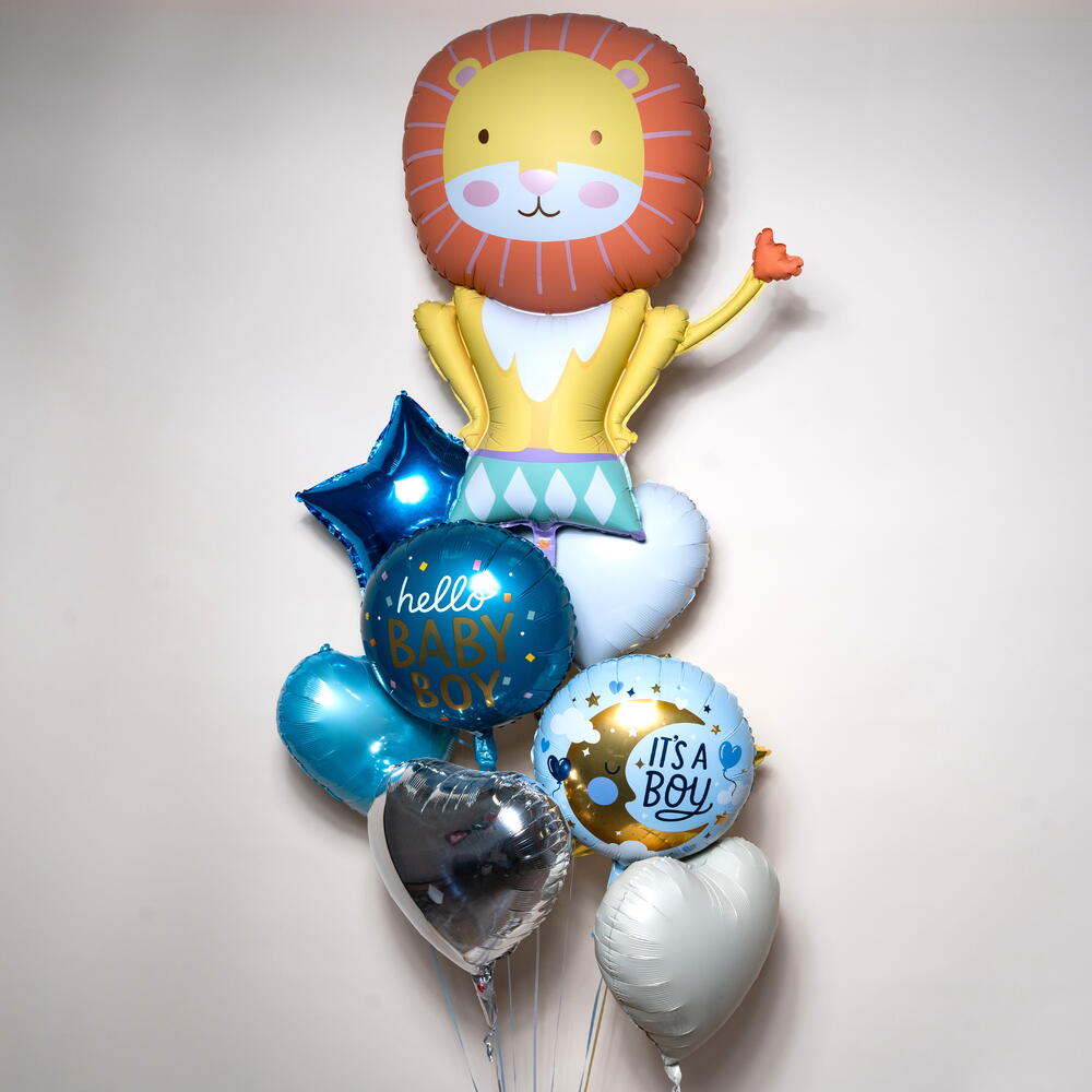 Royal Lion Baby Boy “It’s a Boy” Foil Balloon Set (8 Balloons) This adorable Royal Lion baby boy foil balloon set features 1 big lion foil balloon, 1 round “Hello Baby Boy” balloon, and 1 round “It’s a Boy” balloon, paired with 1 blue star and 4 heart-shaped balloons in light blue, white, silver, and beige. Perfect for baby showers, newborn welcomes, and baby boy celebrations, this charming set adds a sweet and festive touch to any décor. Suitable for home décor, party setups, and photo moments, with a helium float time of approximately 8–10 hours. 🎈🦁👶