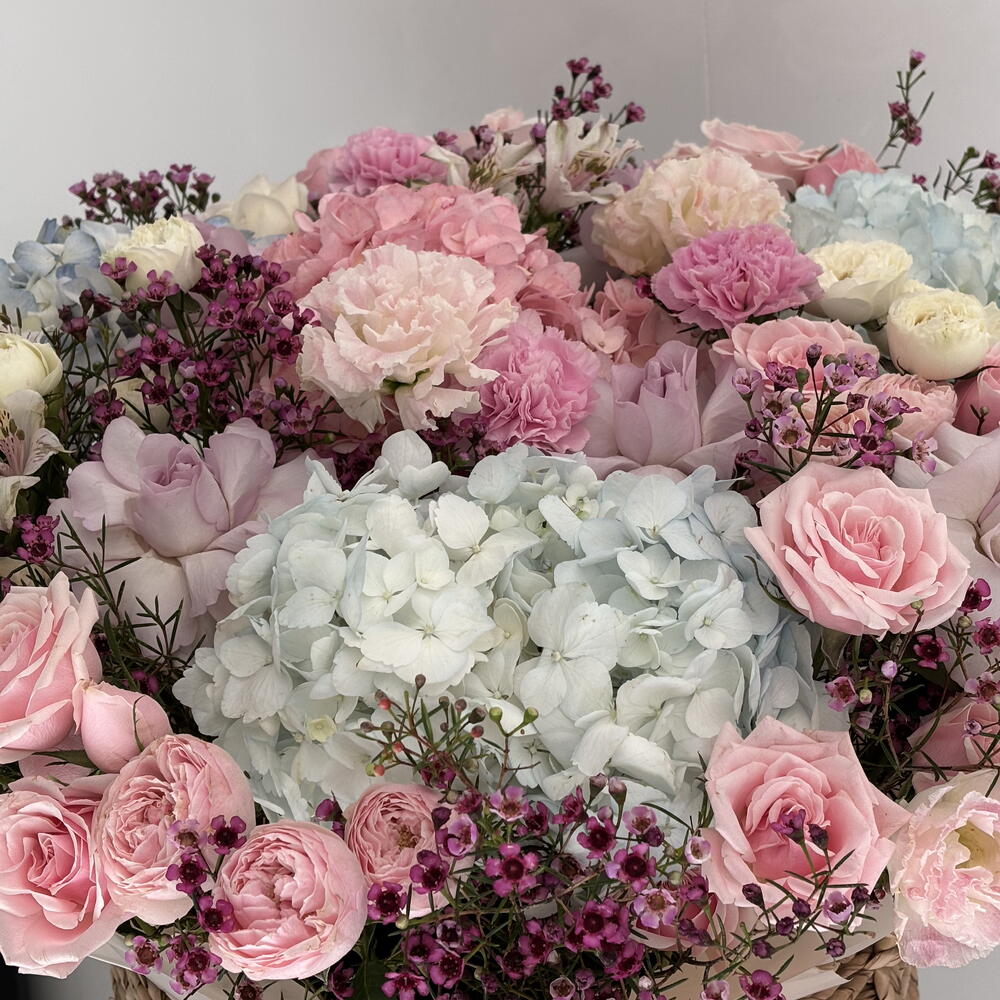 Eustoma - 5 pcs Spray rose - 20 pcs Hydrangea - 4 pcs Wax flower - 12 pcs rose - 20 pcs carnation - 5 pcs basket - 1 pcs alstroemeria - 5 pcs