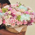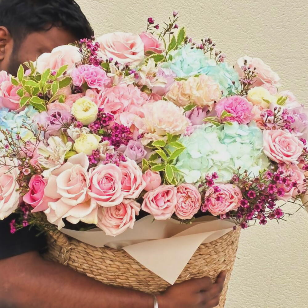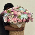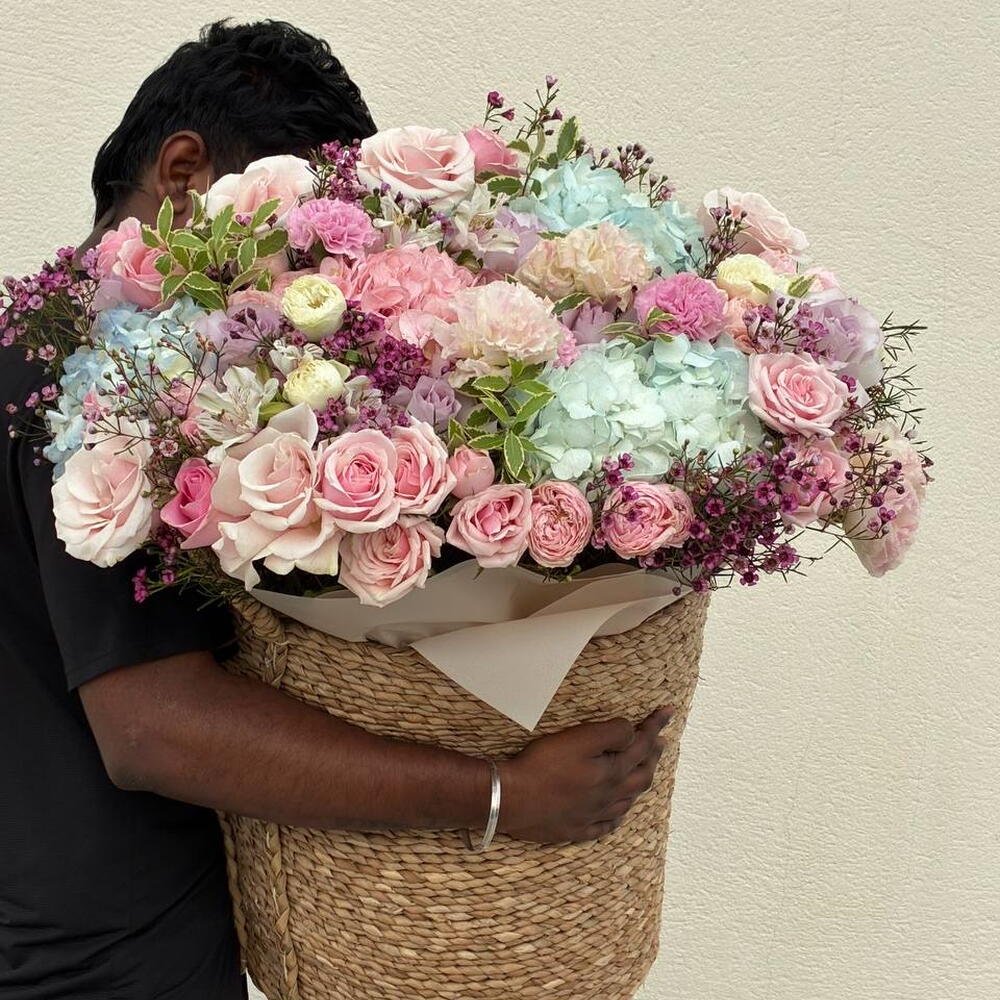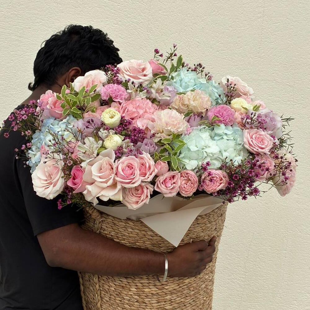 A luxurious giant flower basket with roses and hydrangeas — the perfect choice when you want to truly impress. This large floral arrangement is created with premium fresh flowers: delicate roses, airy hydrangeas, peony-style blooms, and decorative greenery, forming a soft, voluminous, and elegant composition. This large flower basket is ideal for: — birthdays — anniversaries — marriage proposals — romantic surprises — luxury gifts without words Each arrangement is handcrafted by professional florists using only fresh, high-quality flowers and presented in a stylish woven basket. Same-day flower delivery in Dubai is available. The bouquet arrives fully arranged and ready to gift.