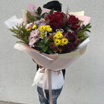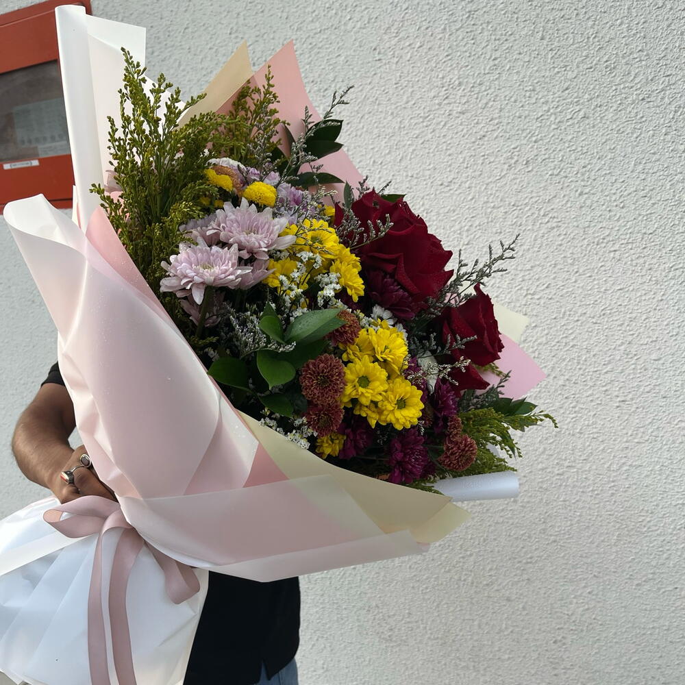 Chrysanthemum - 6 pcs red roses - 3 pcs yellow button - 2 pcs brown button - 2 pcs white button - 2 pcs