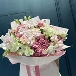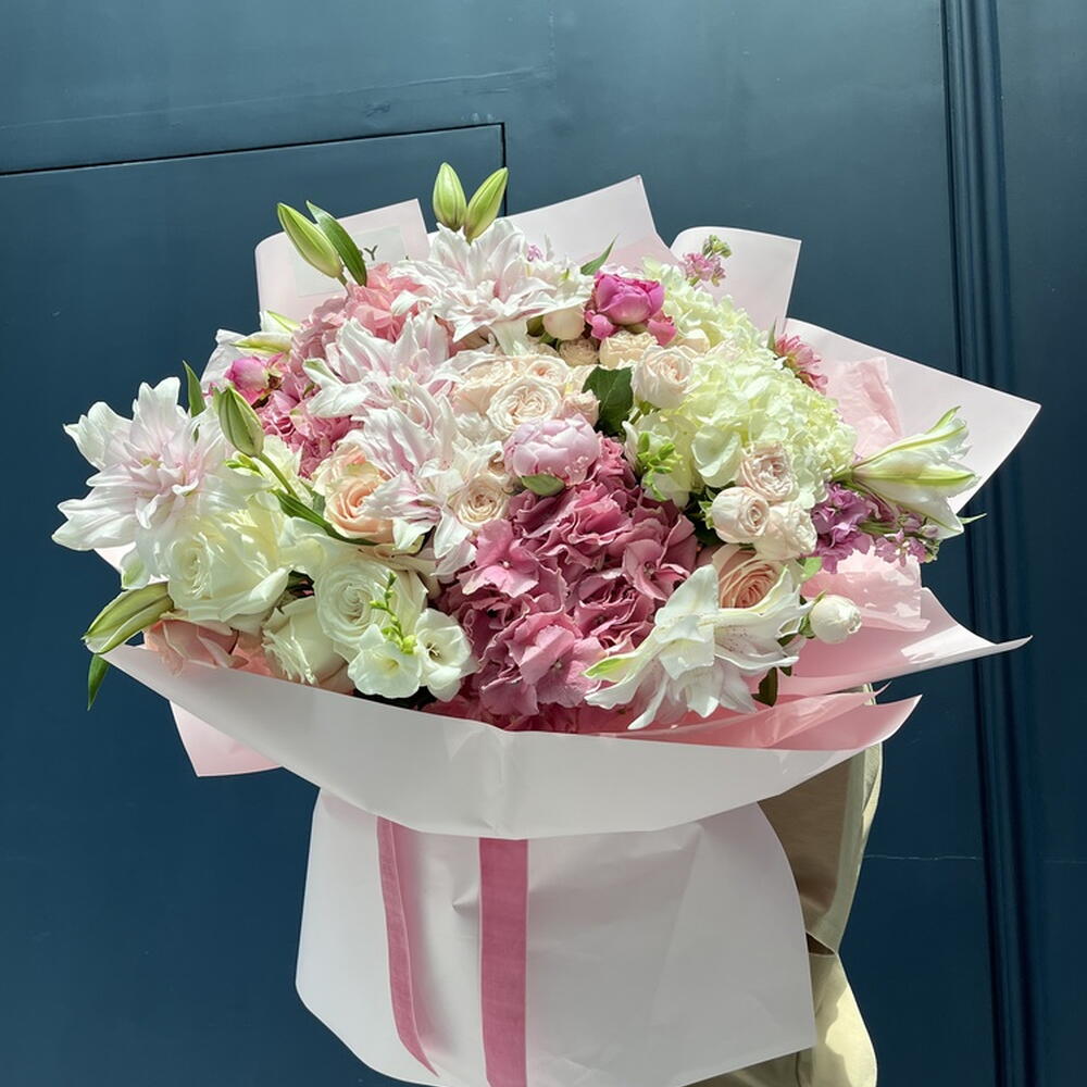 Composition: Hydrangea - 7, Lily Double Oriental - 4, Rose Peach - 7, Rose spray Bombastic - 8, Mattiola - 4, Freesia - 3, Peony import pink - 5 Sizes: WIDTH - 50CM; HEIGHT - 60CM; LENGTH - 60CM; (including packaging) Size: 50 x 60 x 60 cm