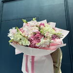 Hydrangea - 7 pcs Freesia - 3 pcs rose peach - 7 pcs mattiola - 4 pcs rose spray bombastic - 8 pcs lily double oriental - 4 pcs peony import pink - 5 pcs