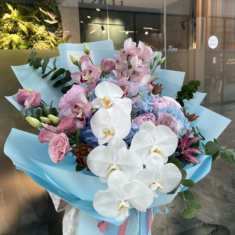 Composition: Hydrangea - 3, Cymbidium - 6, Cymbidium mini - 12, Peony import pink - 5, Eucalyptus - 5, Leucadendron - 5, Lisianthus - 6 Sizes: WIDTH - 55CM; HEIGHT - 65CM; LENGTH - 65CM; (including packaging) Size: 55 x 65 x 65 cm