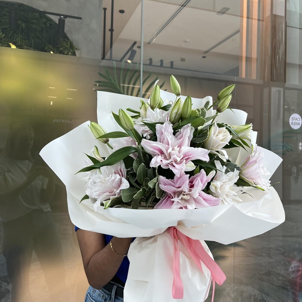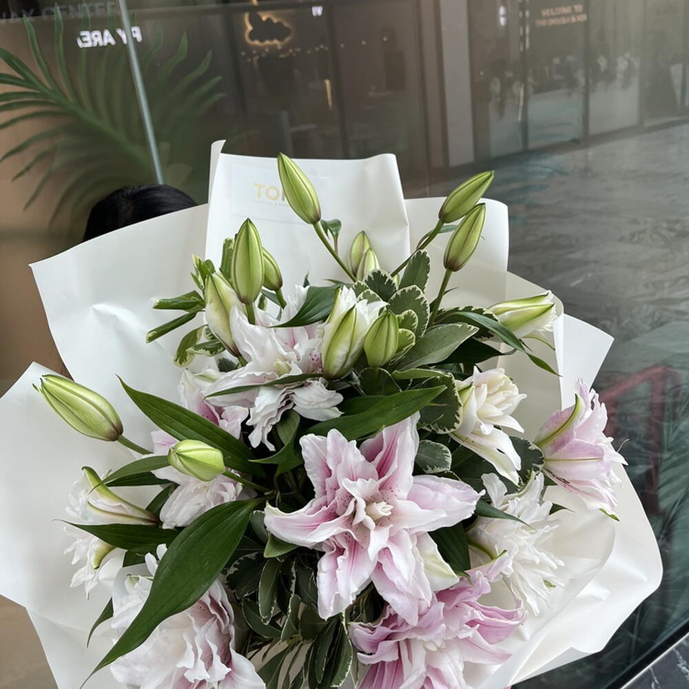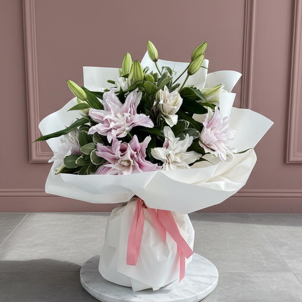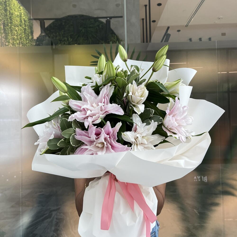 Composition: Lily Double Oriental - 7, Pittosporum - 3 Sizes: WIDTH - 45CM; HEIGHT - 55CM; LENGTH - 55CM; (including packaging) Size: 45 x 55 x 55 cm