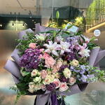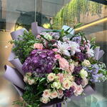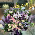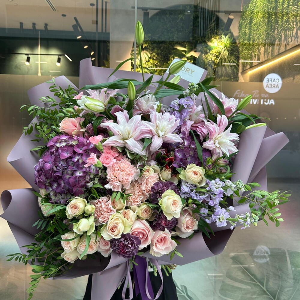 Composition: Lily Double Oriental - 4, Rose sprey Madame Bombastic - 7, Dianthus - 7, Pistacia - 5, pink rose - 5, Mattiola - 3, Alstroemeria - 4, Hydrangea - 2, Dianthus spray - 3, Aspidistra - 2 Sizes: WIDTH - 65CM; HEIGHT - 65CM; LENGTH - 65CM; (including packaging) Size: 65 x 65 x 65 cm