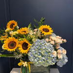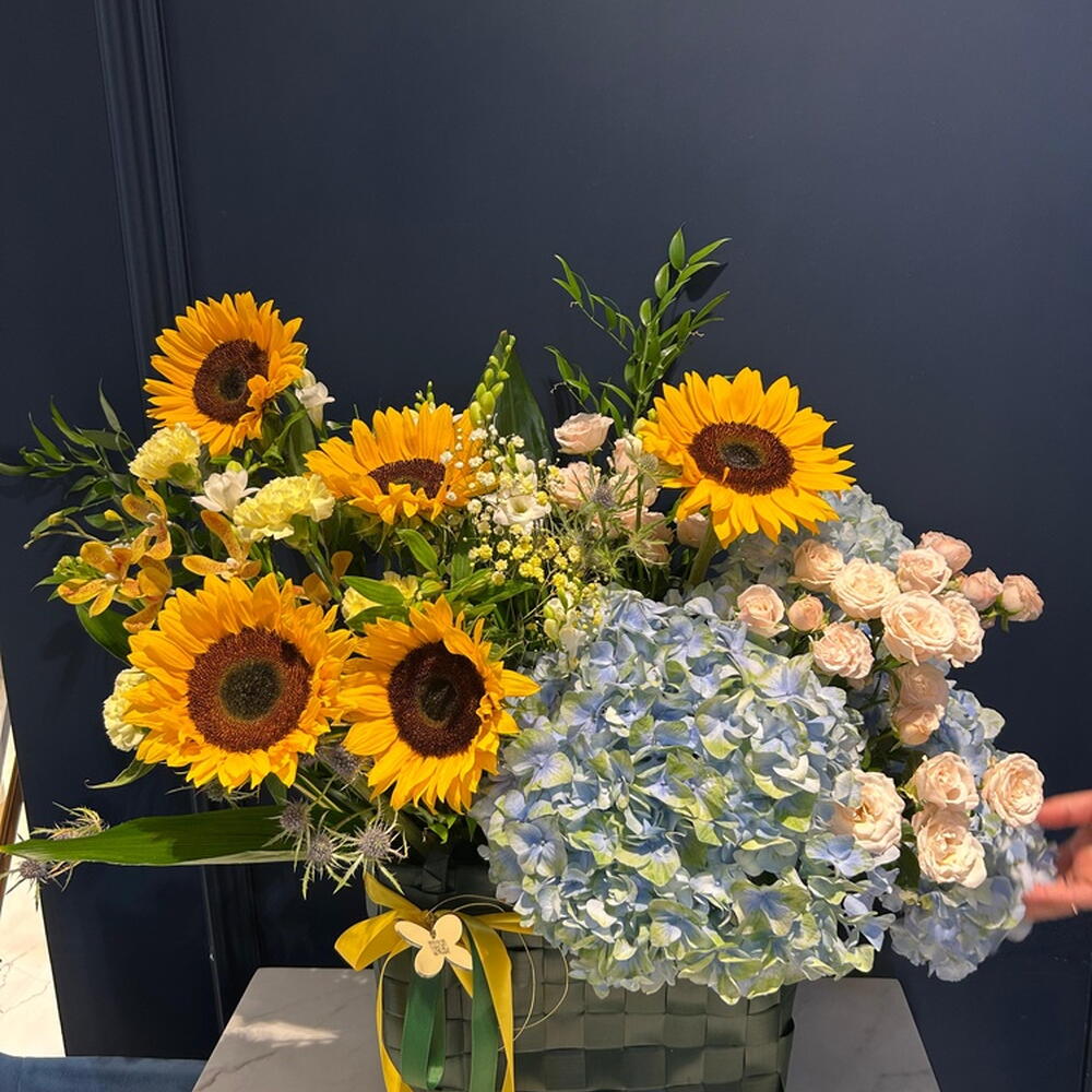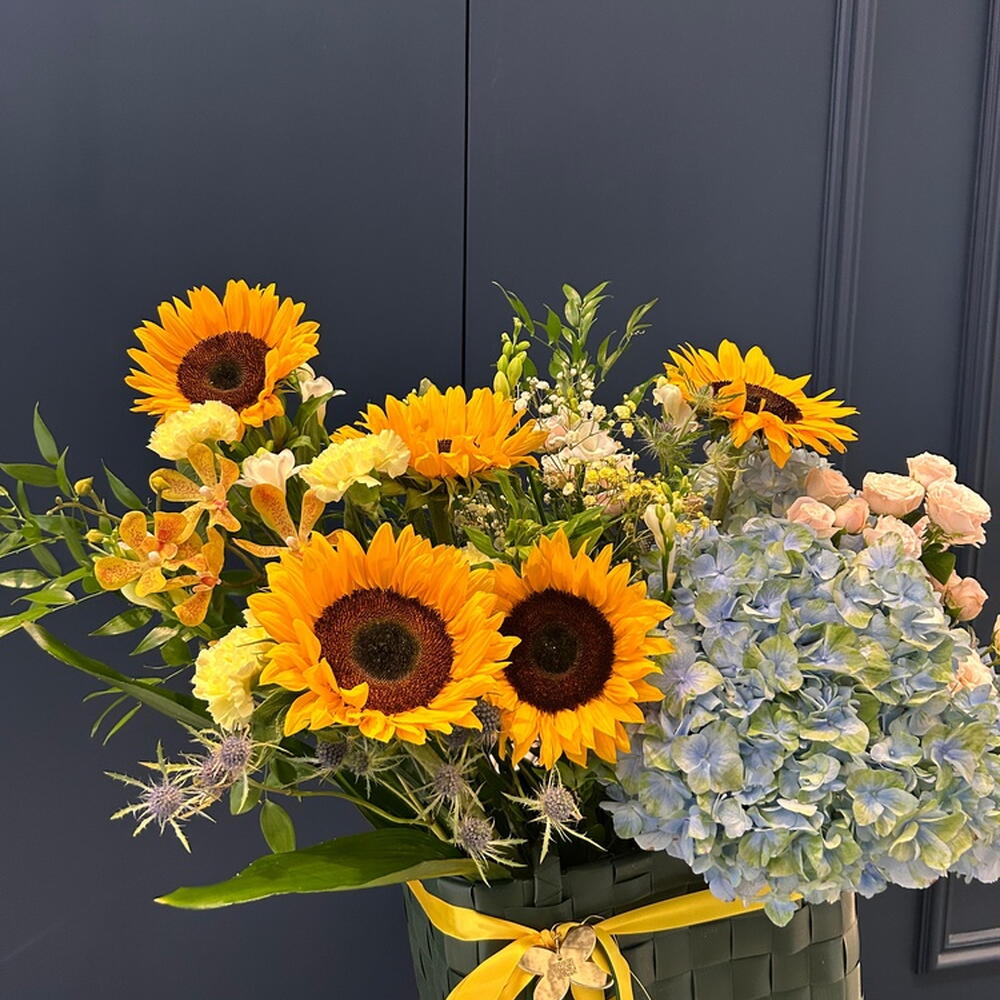 Ruscus - 4 pcs Hydrangea - 3 pcs Eringium - 3 pcs Aspidistra - 3 pcs Freesia - 7 pcs Pistacia - 5 pcs Gypsophila - 1 pcs hypericum - 3 pcs dianthus - 4 pcs bag - 1 pcs sunflower - 5 pcs spray rose odilia light pink - 6 pcs