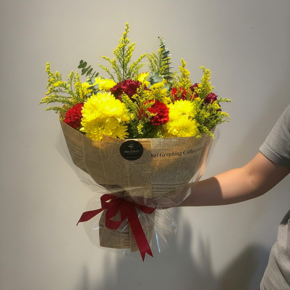 Chrysanthemum - 12 pcs Fern - 2 pcs carnation - 3 pcs wrapping paper - 6 pcs ruscus leaves - 2 pcs