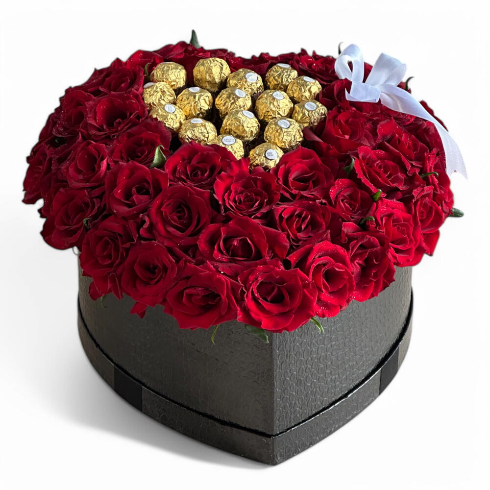 Arrangement of 50 red roses and 16 Pcs ferroro rocher chocolate in a heart shape arrangement.