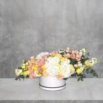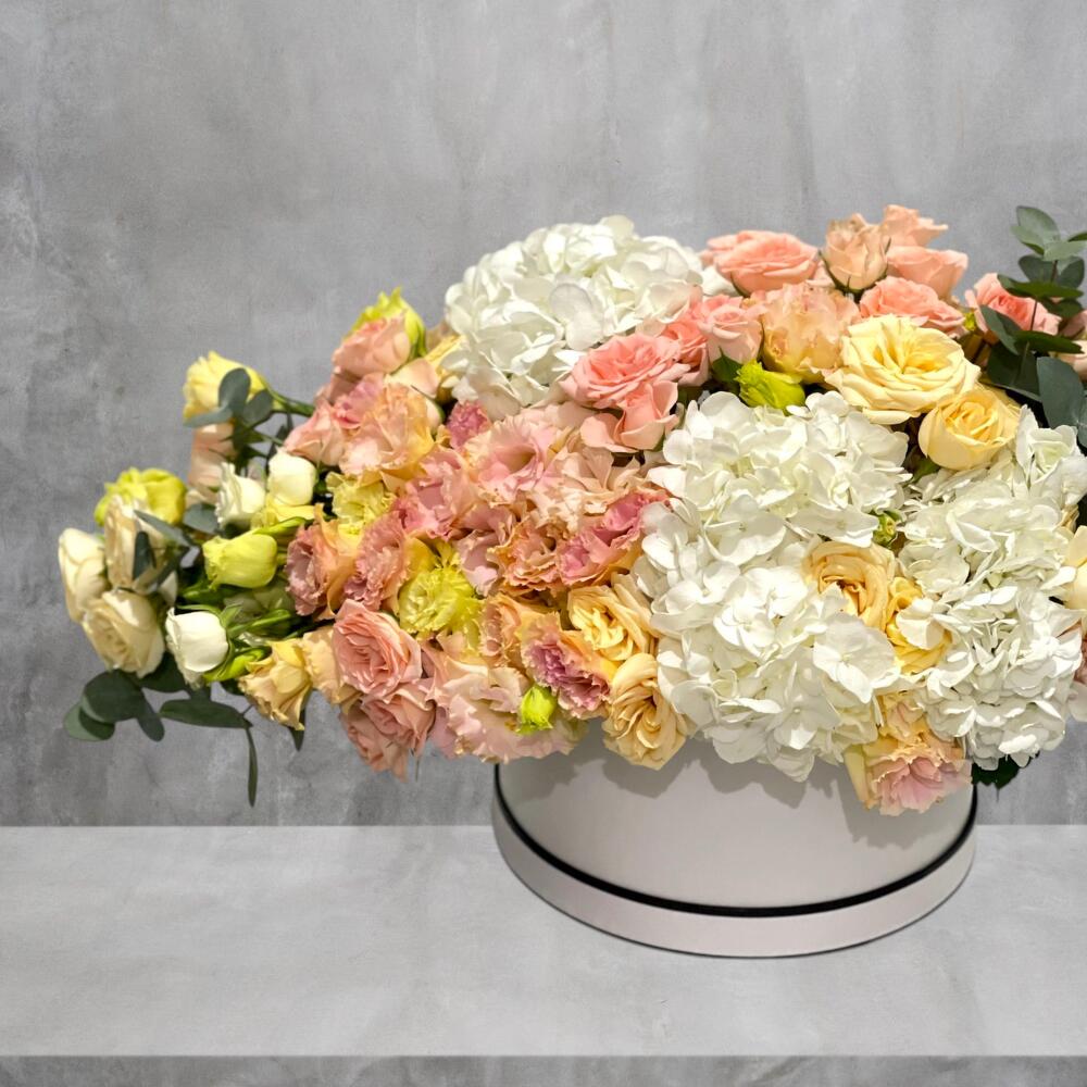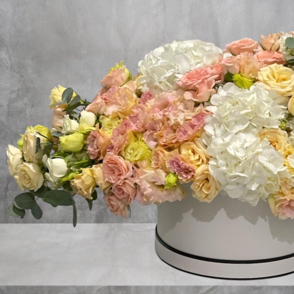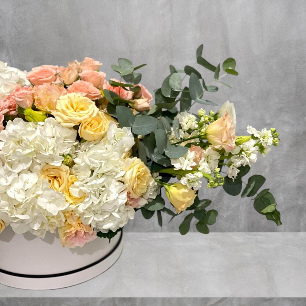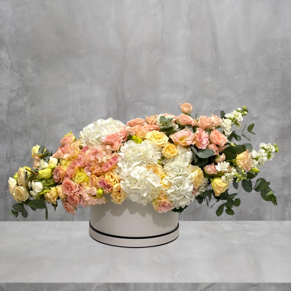 Soft, dreamy, and effortlessly luxurious, Peach Reverie is a grand box arrangement featuring white hydrangeas, delicate beige spray roses, peach spray roses, white Mathiola, and tender peach lisianthus. Sweeping in a sleek white box, the flowing composition spans 80cm in width and 30cm in height and depth, creating a stunning, elongated display that radiates elegance and boutique sophistication. With its harmonious palette of soft whites and warm peaches, creates a pastel-hued tableau of elegance and charm.