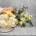 Eucalyptus - 10 pcs white hydrangea - 4 pcs white matthiola - 5 pcs sweet sara spray roses - 10 pcs peach lisianthus - 10 pcs salenaro spray roses - 10 pcs