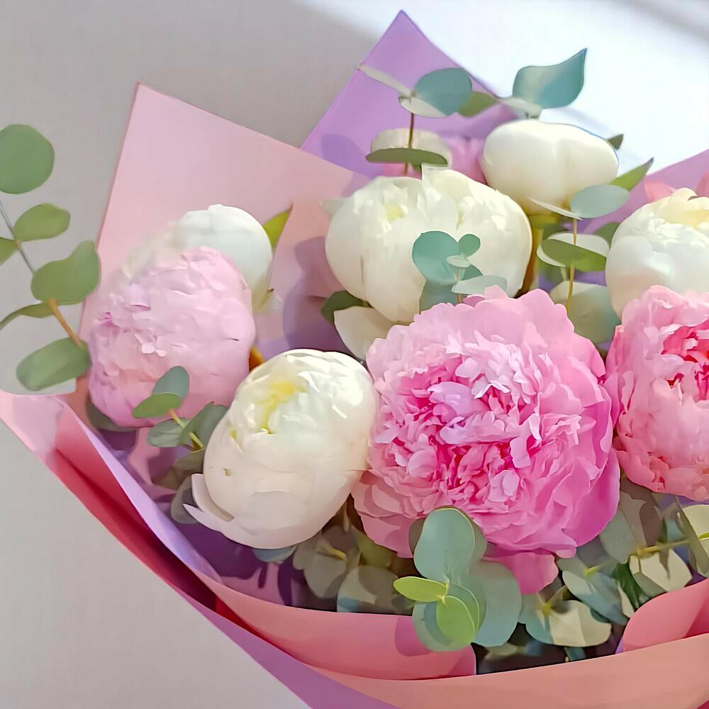 Eucalyptus - 3 pcs Peony pink - 6 pcs peony white - 5 pcs