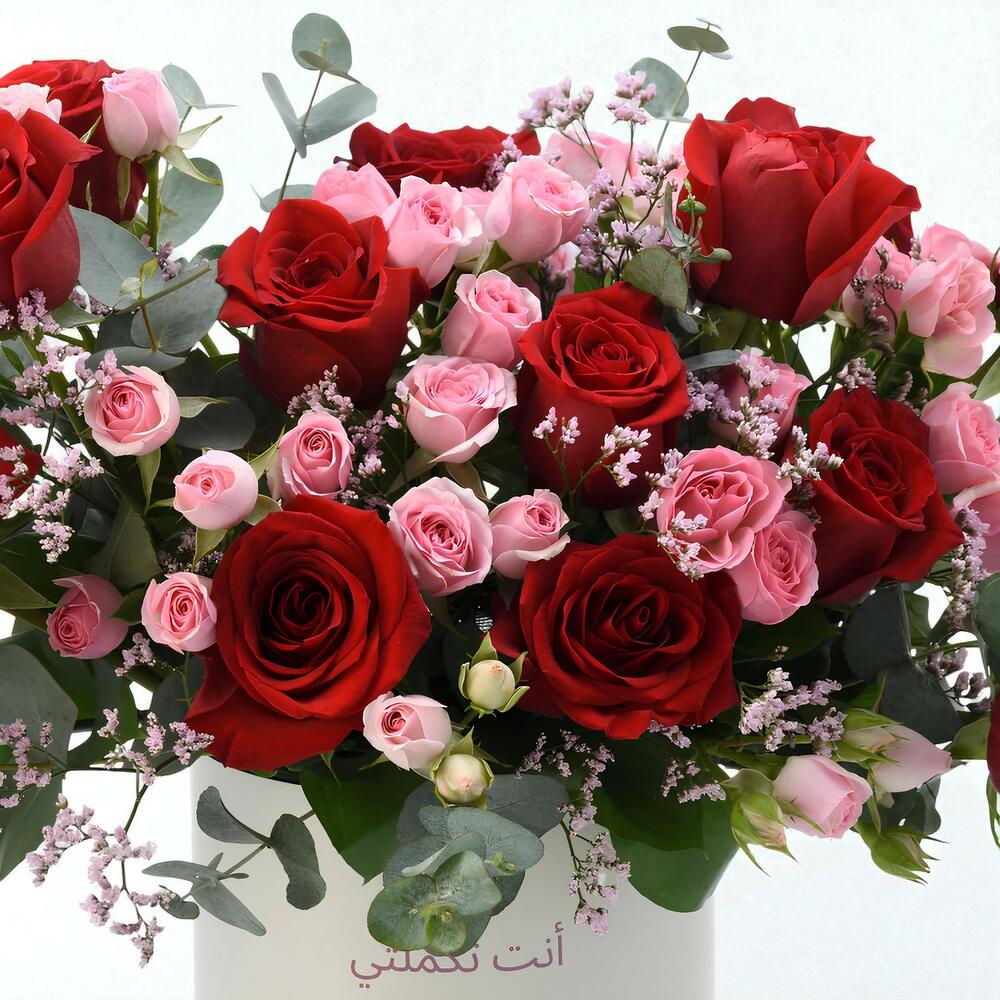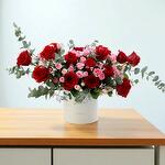 Eucalyptus - 7 pcs pink limonium - 5 pcs pink spray roses - 5 pcs radiant red roses - 15 pcs