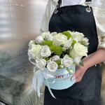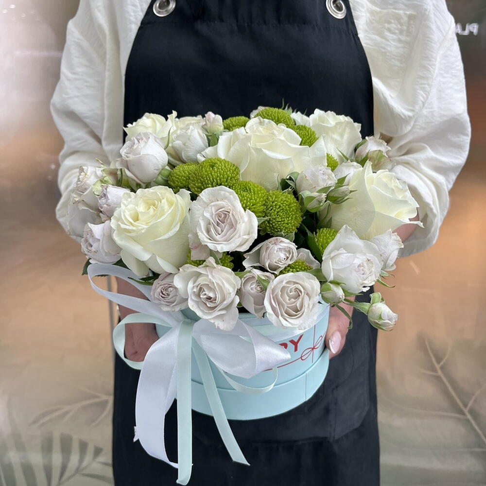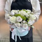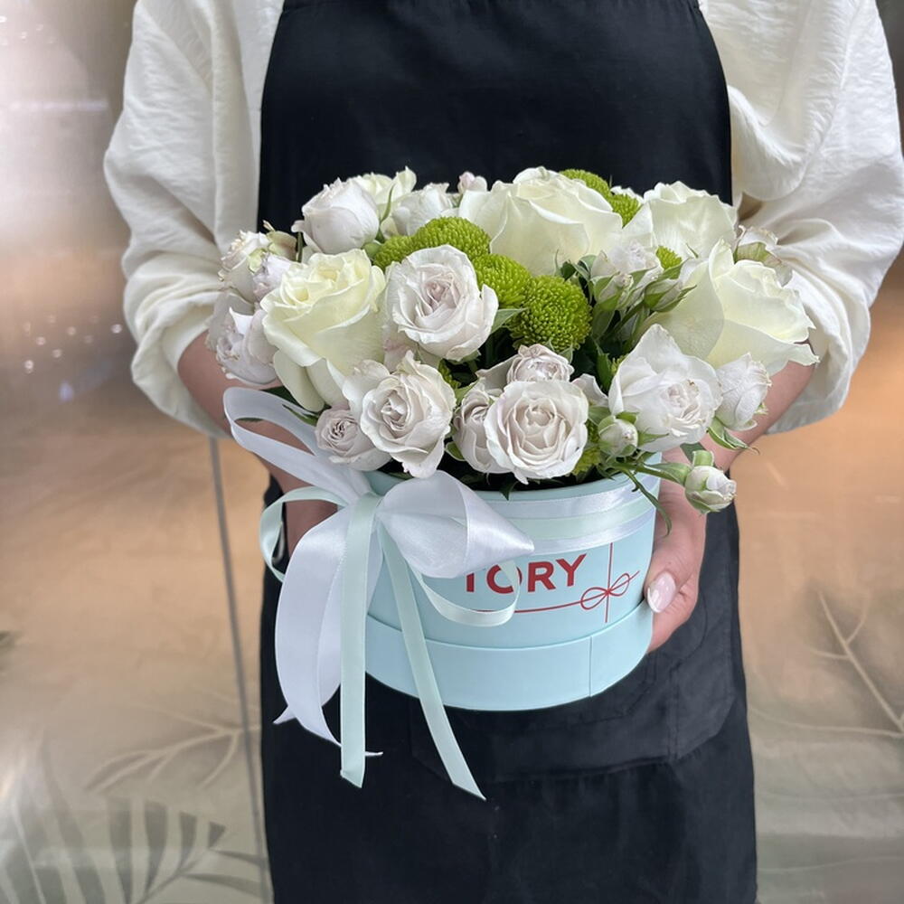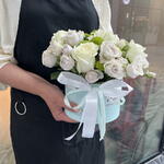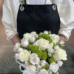 Composition: Rose white - 5, Spray Rose Odilia light pink - 5, Chrysanthemum spray - 2 Sizes: WIDTH - 17CM; HEIGHT - 20CM; LENGTH - 20CM; (including packaging) Size: 17 x 20 x 20 cm