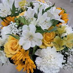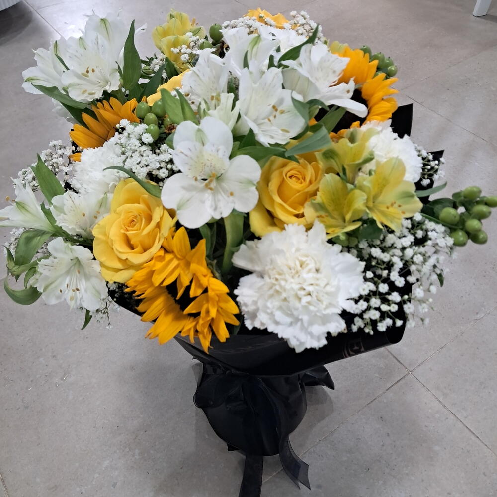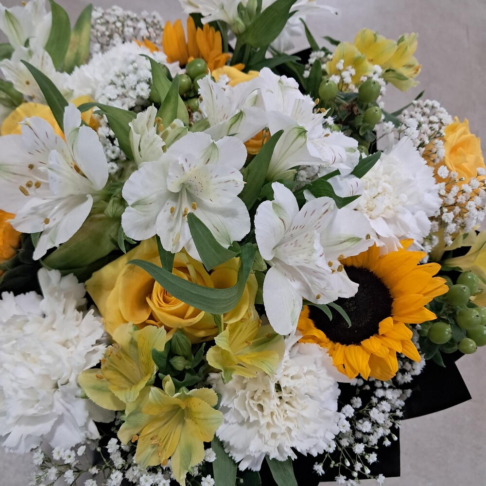 Gypsophila - 6 pcs white carnations - 5 pcs alstroemeria white - 4 pcs alstroemeria yellow - 3 pcs sunflower yellow - 3 pcs yellow roses - 4 pcs hypericum berries green - 4 pcs
