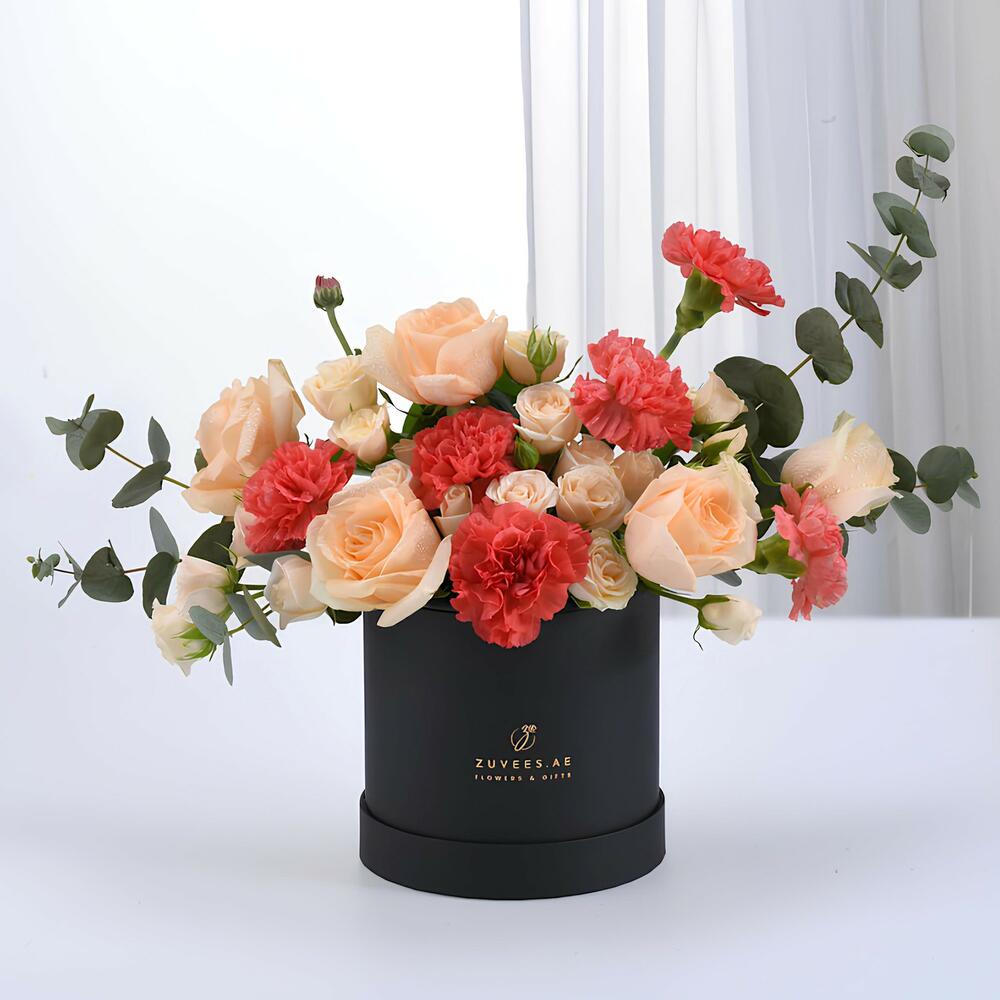 Eucalyptus - 5 pcs red carnations - 7 pcs spray roses - 7 pcs peach roses - 10 pcs