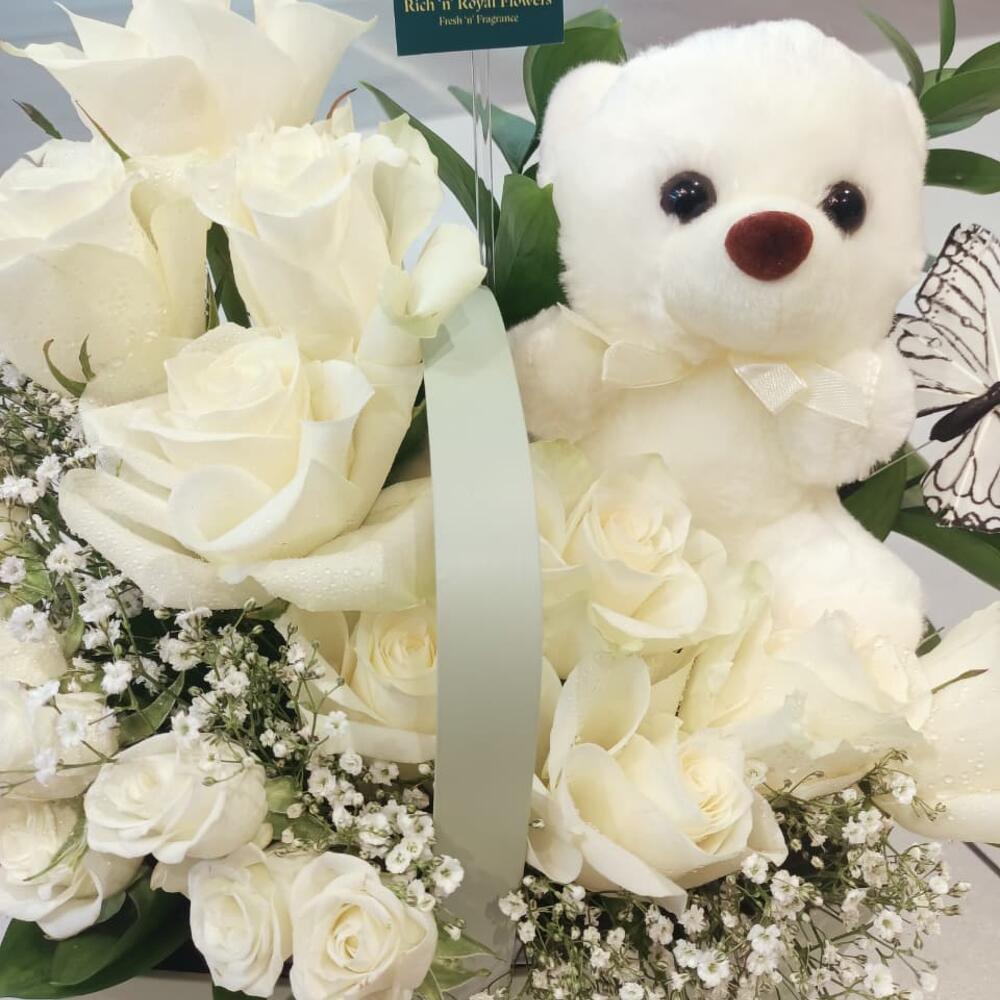 Sweet Teddy White Blooms Basket