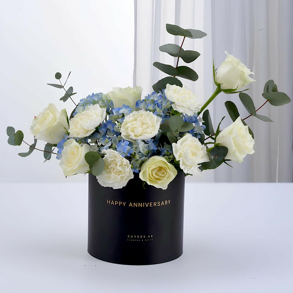 A graceful blend of soft white blooms and delicate blue hydrangea, this stunning arrangement symbolizes purity, tranquility, and devotion. Nestled in a luxurious ‘Happy Anniversary’ box, it’s the perfect gift to celebrate love, joy, and timeless elegance. ✨ Please note: The box of this arrangement can be customized in different colors upon request. Available options include: White, Desert Sand, Sand Theme, Red Theme, Black Theme, and Black.